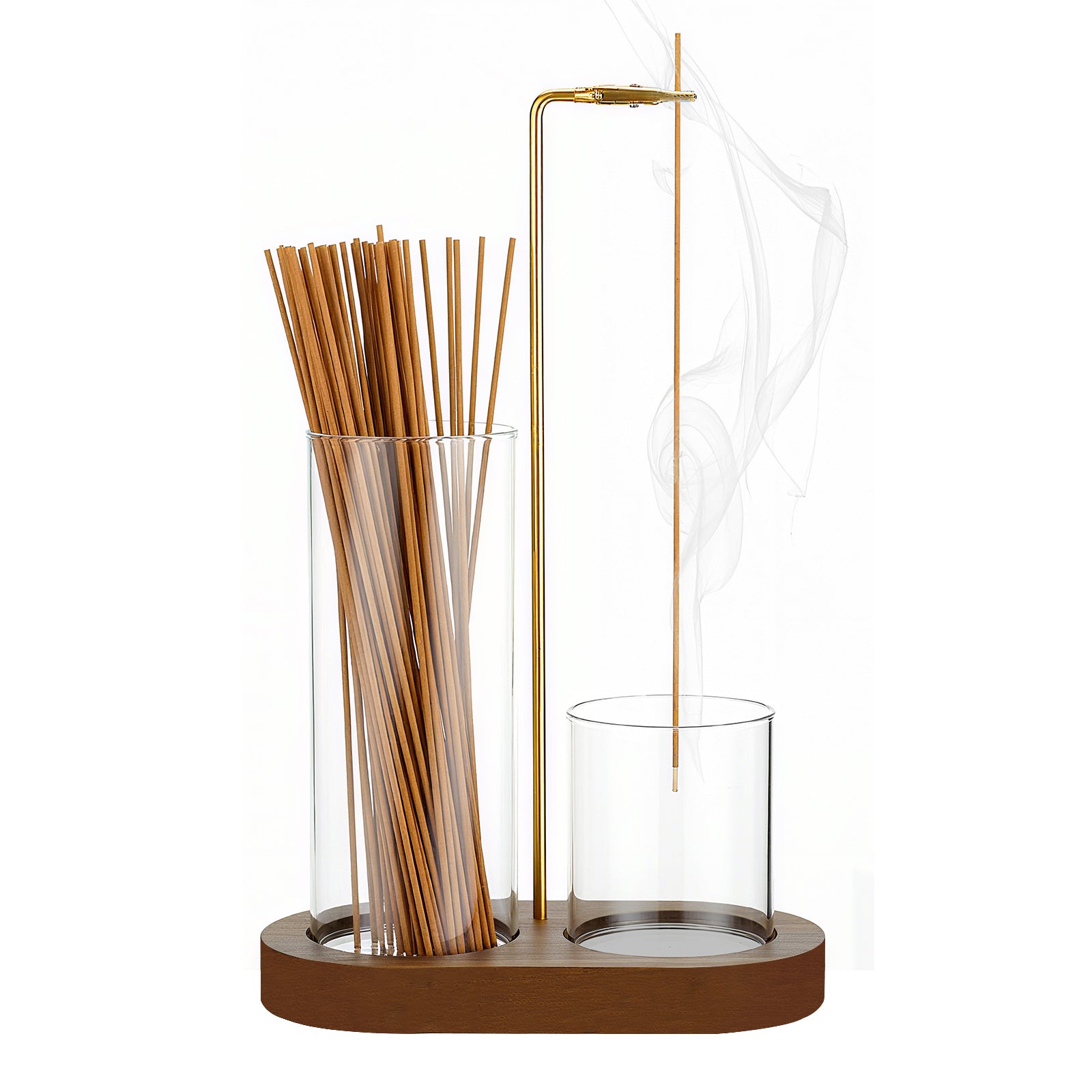 Balanced like the figure-eight, this solid wood incense holder turns a simple burn into a refined ritual. A slender metal arm with a precision crocodile clip suspends the stick at the ideal angle, while the paired clear glass cup below gathers every speck of ash—so the room stays serene and the surface stays immaculate.